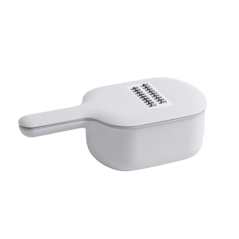This cutter features four blade options 4 mm julienne, 3 mm julienne, wavy slicer, and standard slice providing different cutting styles for a range of kitchen tasks. A built-in drainage function allows washing and draining in the same container for added convenience. The back of the upper cover includes a storage area to keep the blades together when not in use. A hand protection accessory is included to help protect fingers during operation. The smooth handle and matte, non-slip surface offer a comfortable grip.
